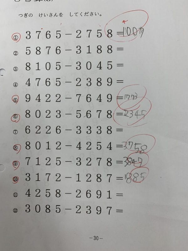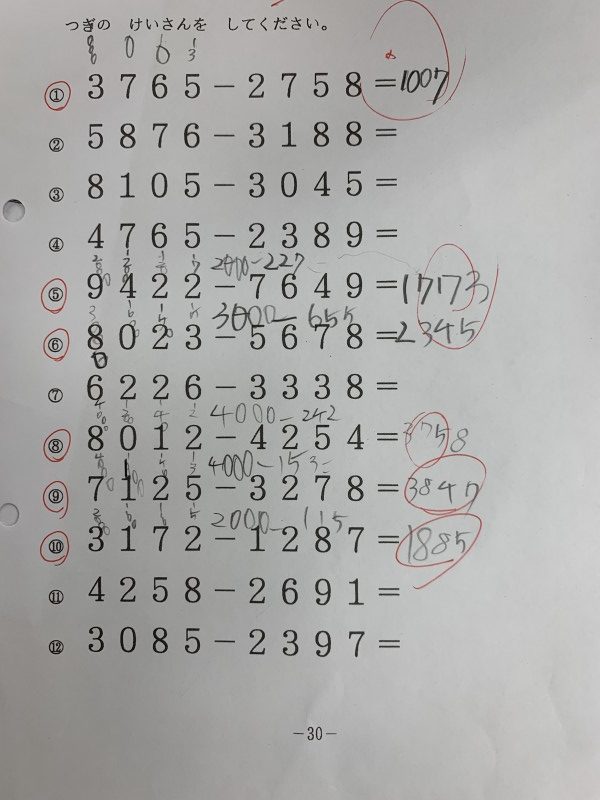 100までの加減、1000までの加減を進めて、今日は1万まで(4桁−4桁)の減法。