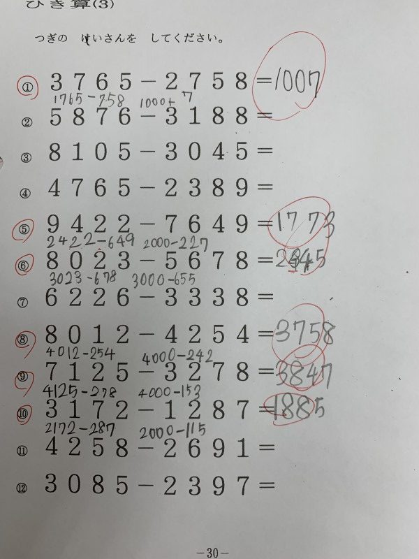 4桁減法が出来ることは、もちろん素晴らしいですし、すごいことなのですが、何よりそれを考えるだけの、「論理的思考力」「思考体力」が素晴らしい!