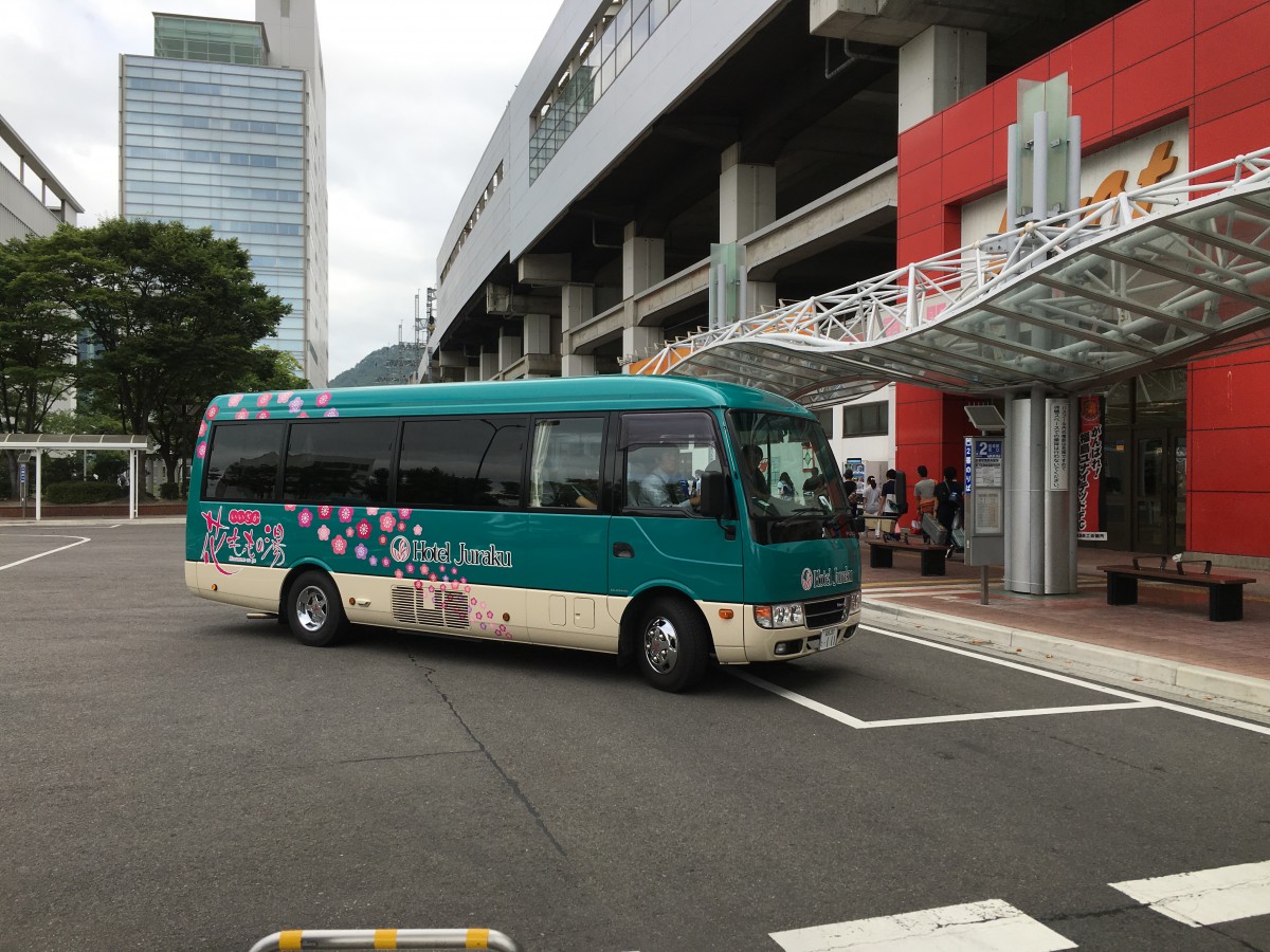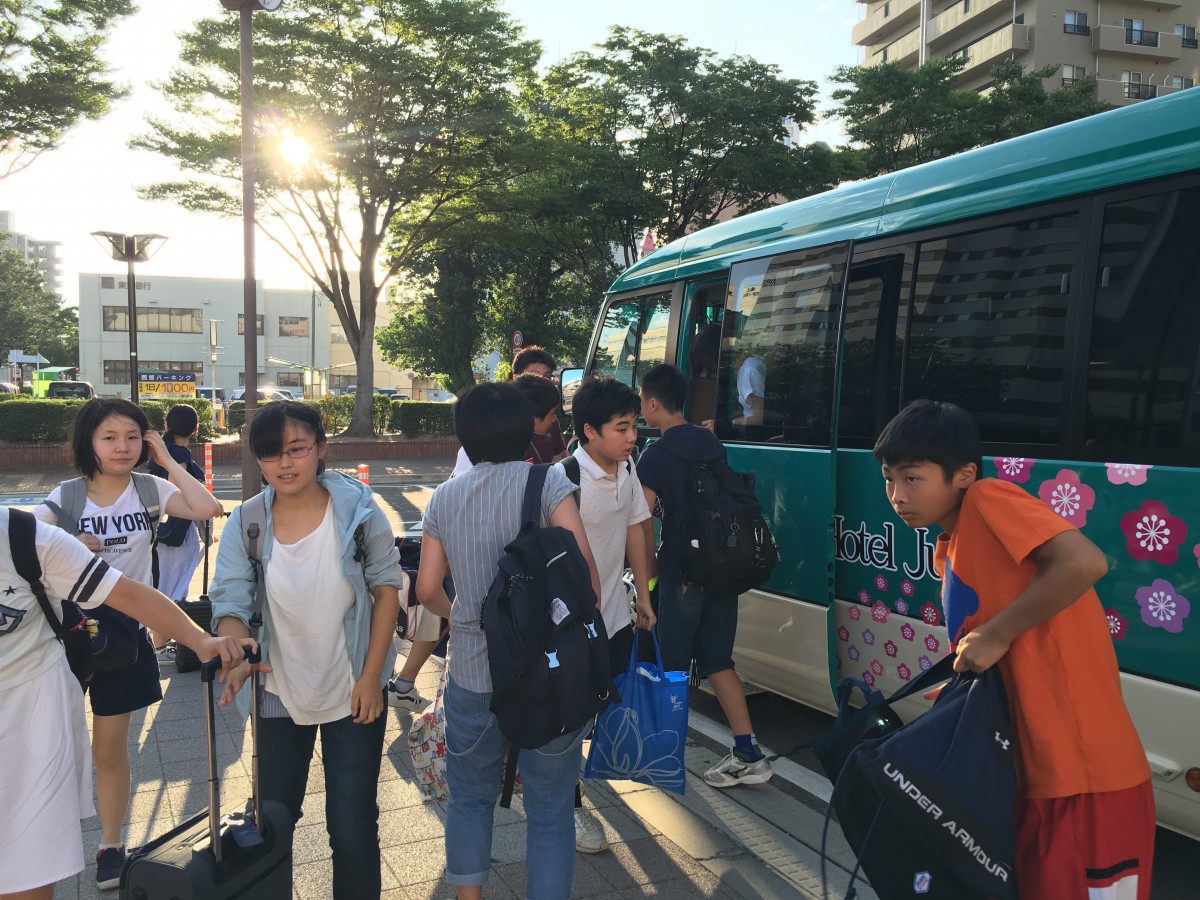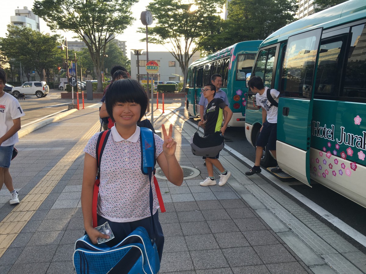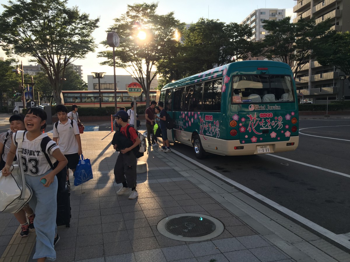 送迎バスに乗り込んで、いざ会場の飯坂温泉・ホテル聚楽へ。