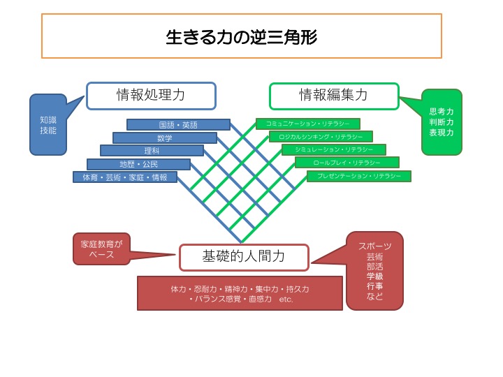 「生きる力の逆三角形」=情報処理力・情報編集力・基礎的人間力