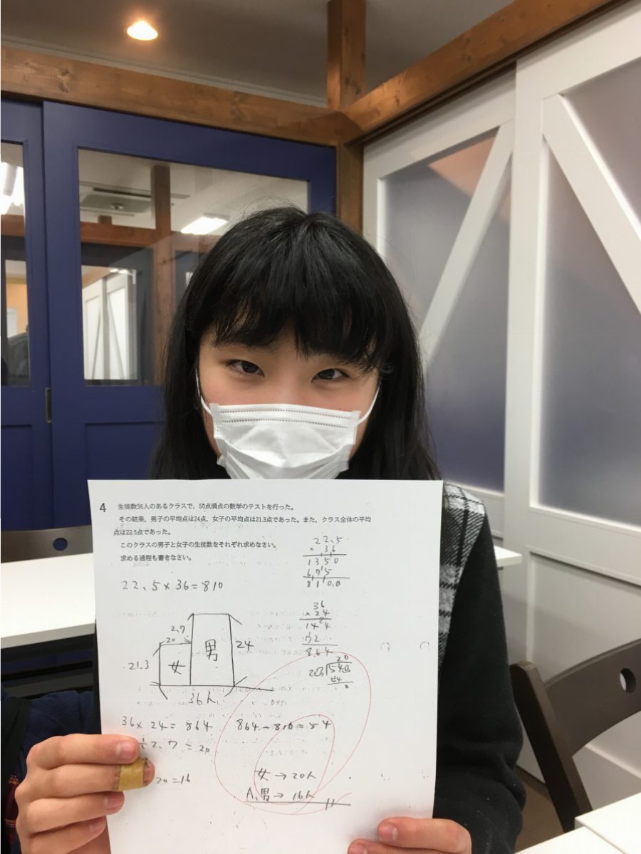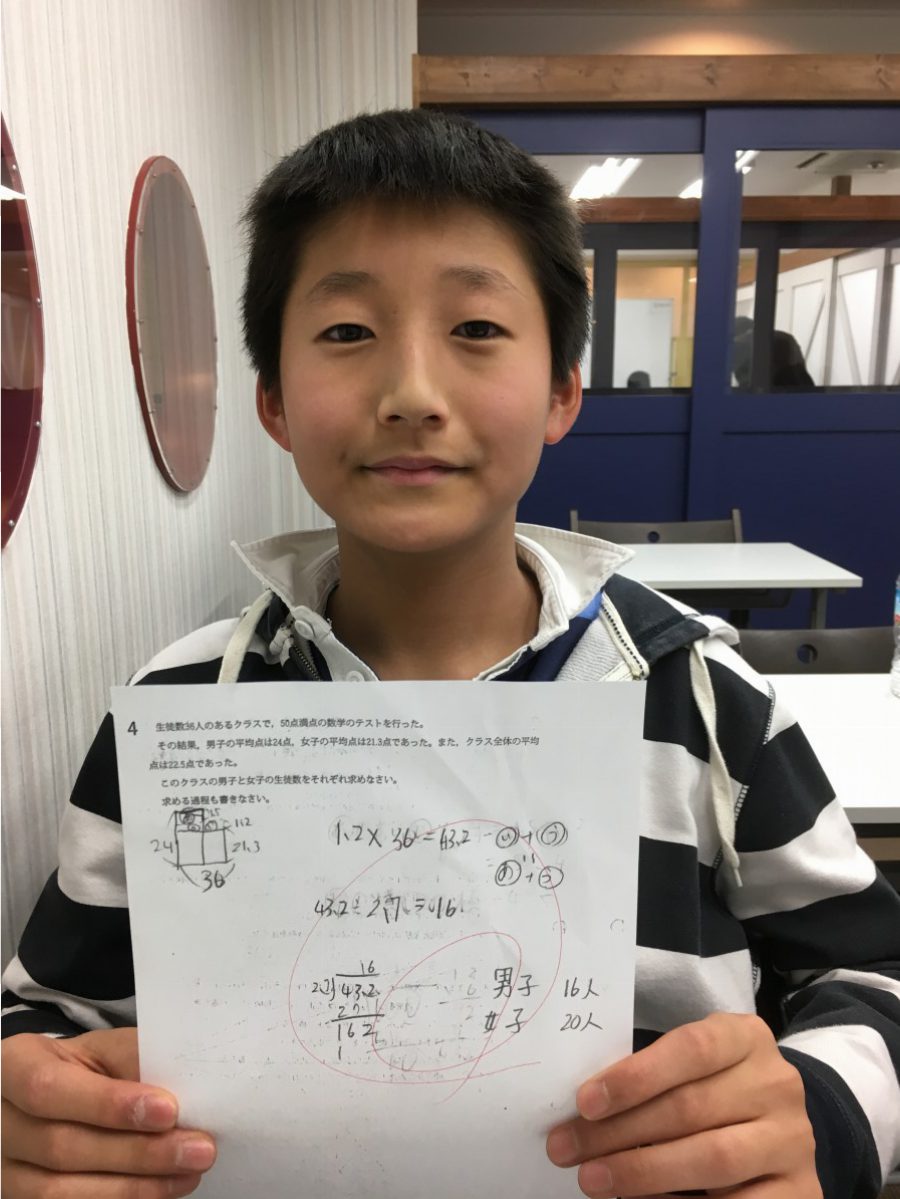 この子たちは、方程式も連立方程式も知りません。平均や、面積図(ちょっとした特殊算)を知っているだけです。それだけの手持ちの武器で高校入試問題を突破してしまいました。
